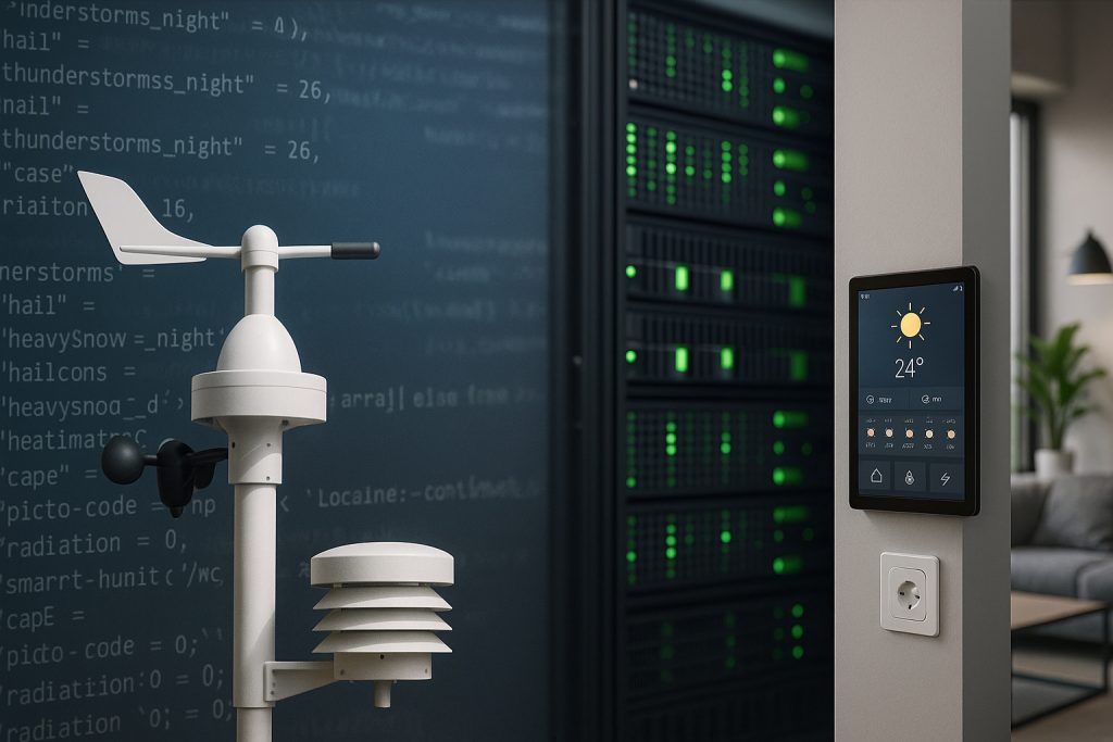 - Another script (via cron) regularly downloads real forecast data from a public API (Yr.no / Open-Meteo / OWM) and caches it as JSON.